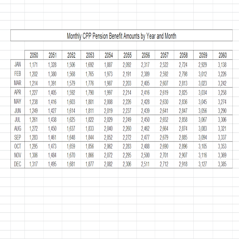 Calculation of your CPP monthly benefit amount from 60 months before your 65th birthday to 60 months after. A grid of 121 monthly benefit possibilities.