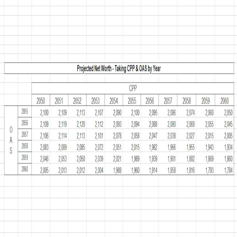 Find the optimal year to take your CPP and OAS. From 5 years early to 5 years later for CPP, and from age 65 to age 70 for OAS. 66 possibilities.